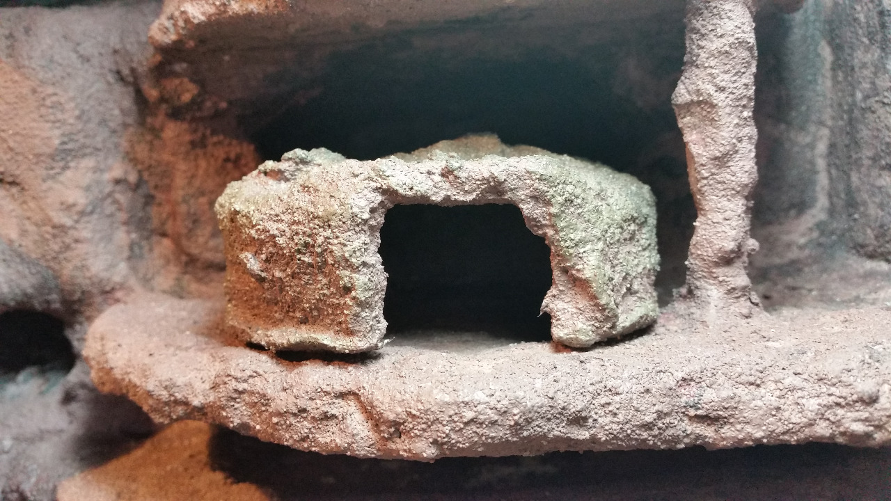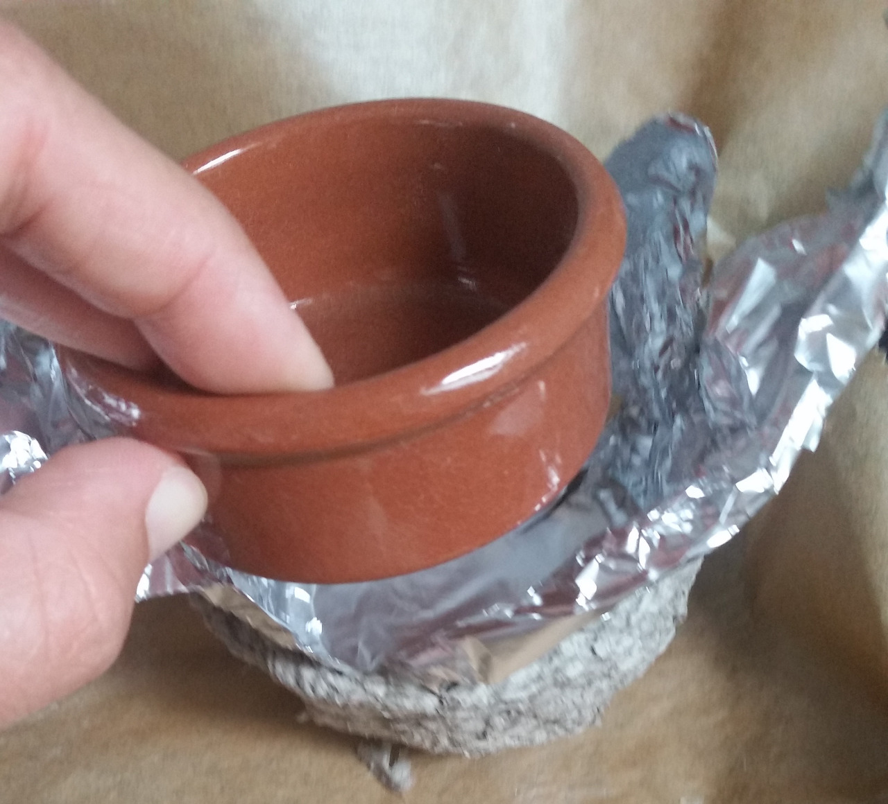 - Nun wird die Pulpe auf die vorbereiteten Gegenstände aufgetragen. Dabei muss man darauf achten, dass die Masse gleichmäßig verteilt wird, vor Allem dürfen die Wände der Höhlen nicht zu dünn werden, da sie ansonsten zu instabil sind. Beim Auftragen nicht vergessen, die kleinen Eingänge frei zu lassen, durch die die Geckos später in die Höhle gelangen. Bei Bedarf kann man mit Hilfe eines stumpfen Messers eine Struktur in die Masse einarbeiten. Das Ganze auf das Backblech stellen und eine Woche lang trocknen und aushärten lassen.